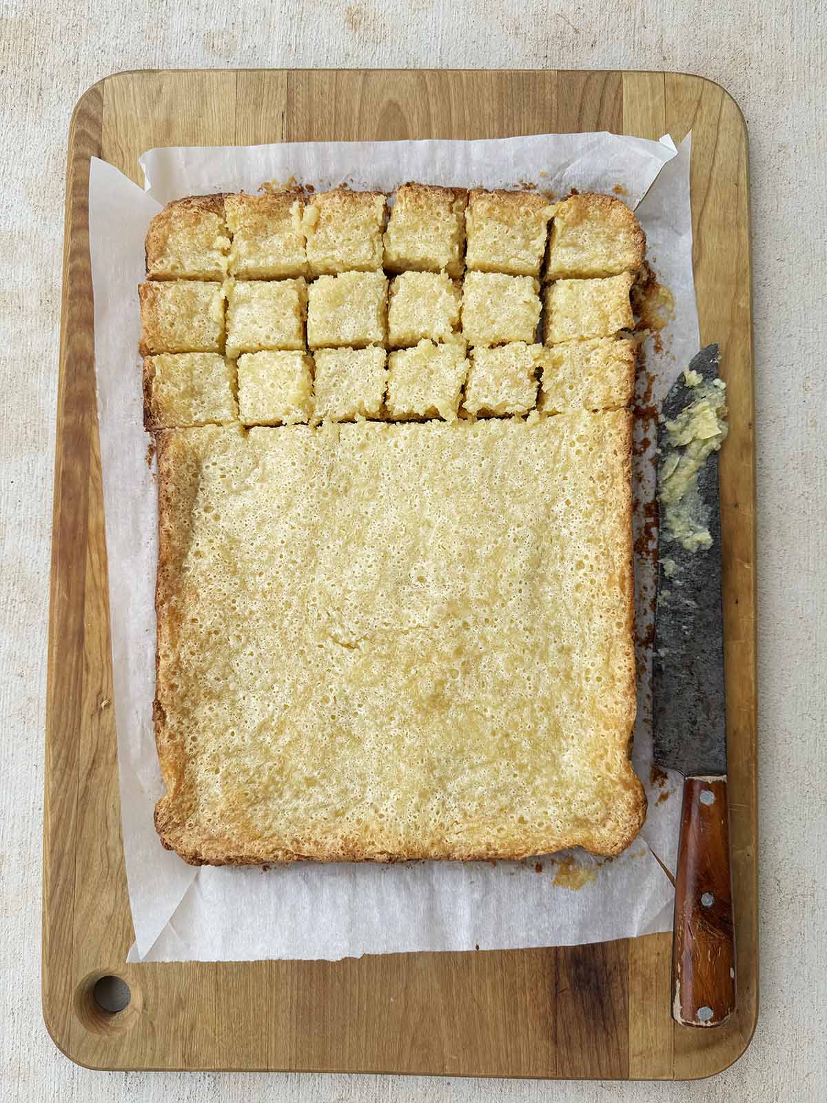 - Completely cooling and refrigerating the chess bars before cutting will make them much easier and less messy to cut. I also recommend wiping off the knife a few times during cutting.