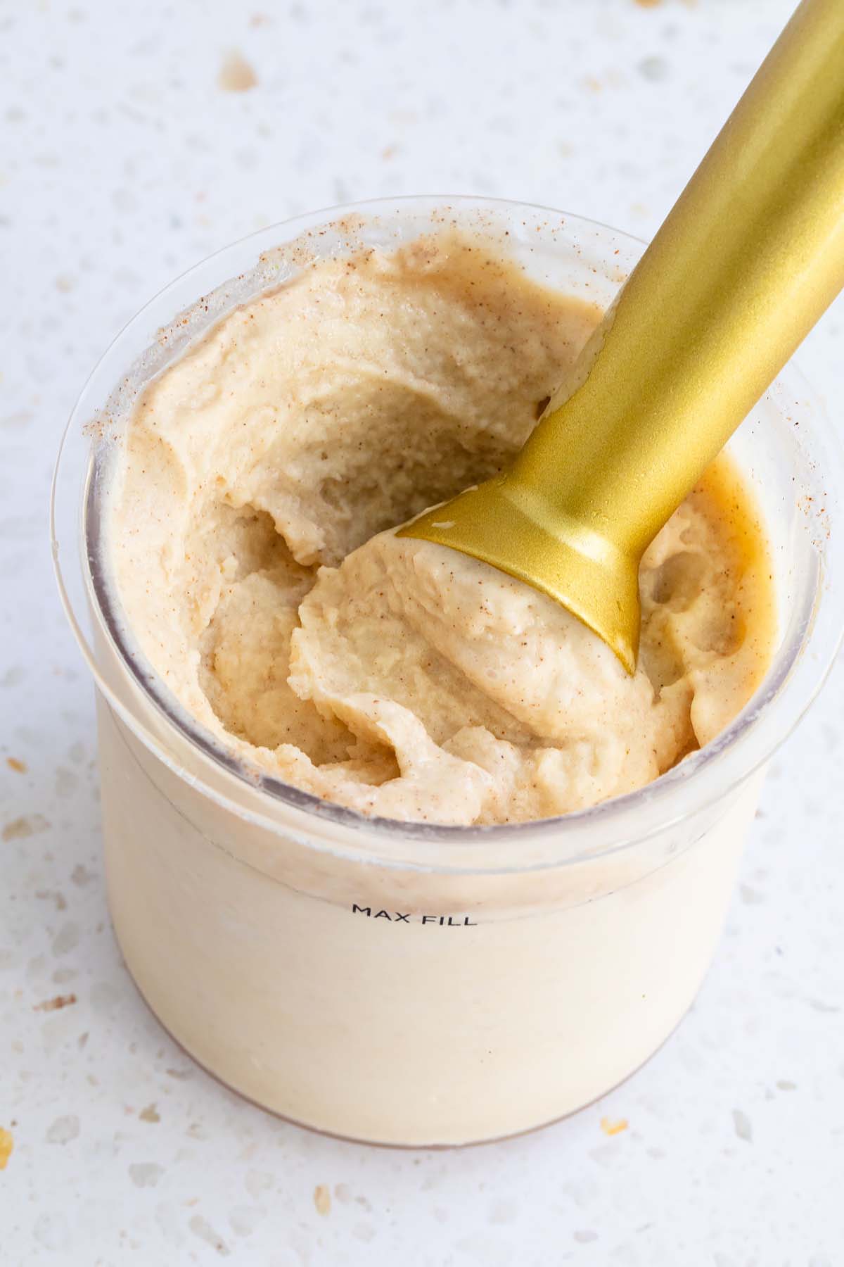 Ninja Creami apple cinnamon ice cream is easy to make using applesauce and a few other ingredients. You don't even need a blender! Just stir everything up and freeze.